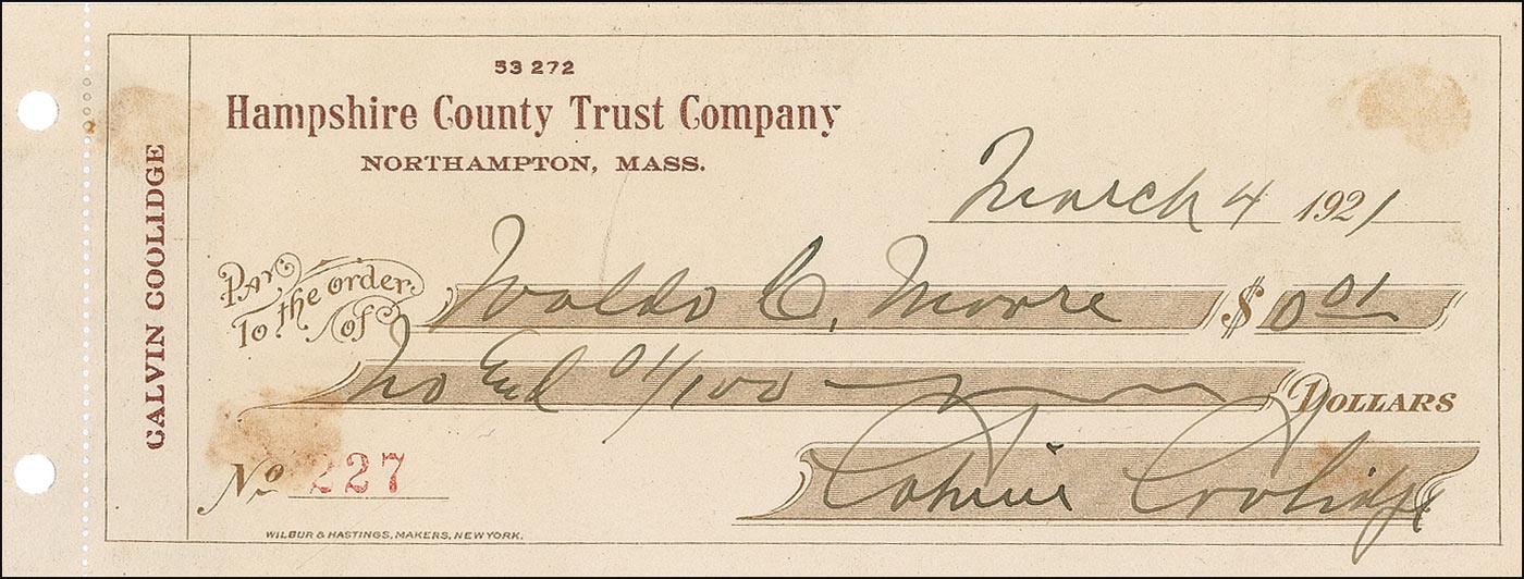 Rare and unusual personal check, 7 x 2.75, filled out in another hand and signed by Coolidge, payable to Waldo C. Moore for $0.01, March 4, 1921, the date of his inauguration as vice president. In fine condition, with light vertical fold, and four spots of mounting residue visible from the reverse that touches the “lidge” in his signature. Interestingly, the original check binder holes and perforations to left edge are still present. Pre-certified John Reznikoff/PSA/DNA and RRAuction COA.
