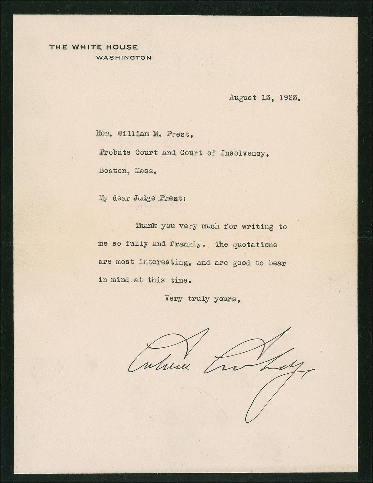 TLS as president, one page, 7 x 9, black-bordered White House letterhead, August 13, 1923. Eleven days after Warren Harding’s death, Coolidge writes William Prest of Boston, Mass. In full: “Thank you very much for writing to me so fully and frankly. The quotations are most interesting, and are good to bear in mind at this time.” Letter is archivally sleeved in acid-free Mylar. In fine condition. Accompanied by the original black-bordered White House mailing envelope which is torn and missing a corner. Pre-certified John Reznikoff/PSA/DNA and RRAuction COA.