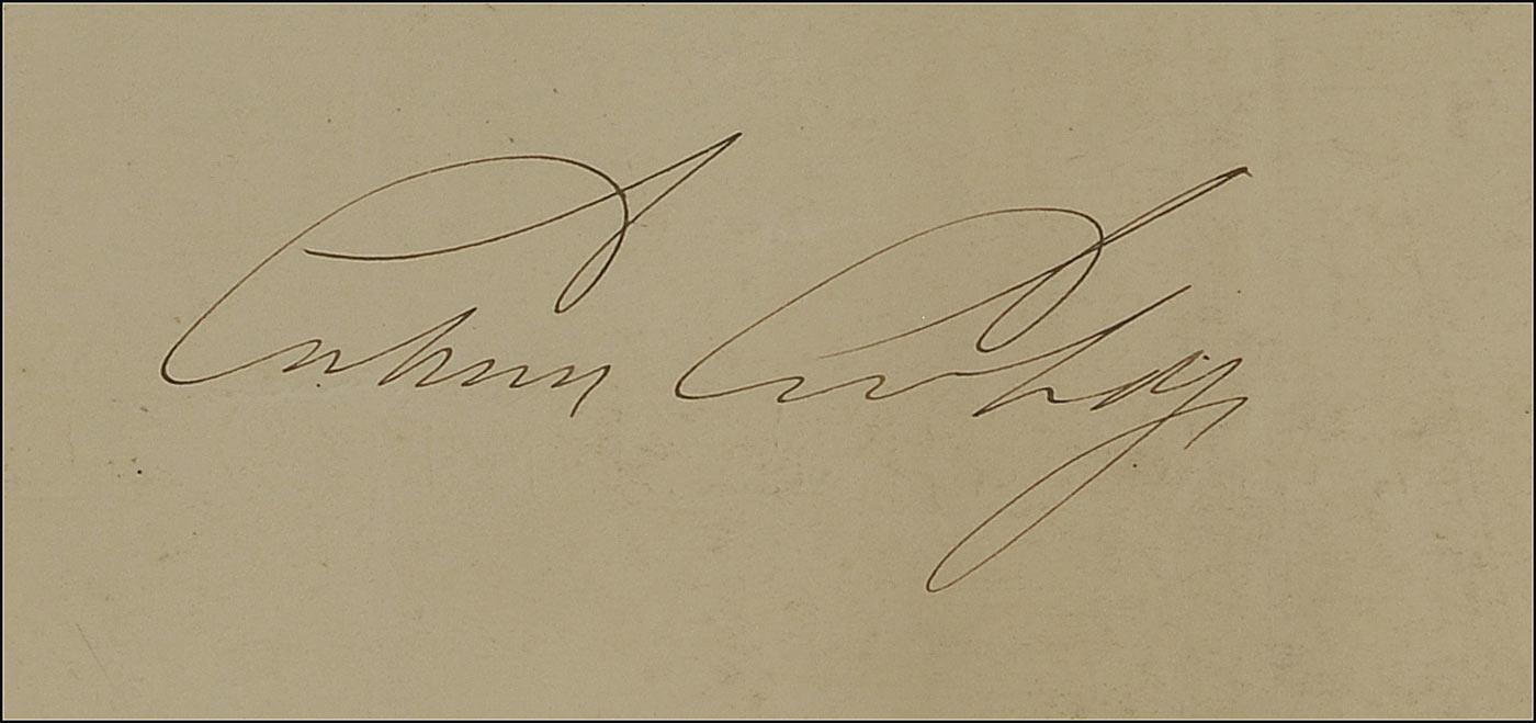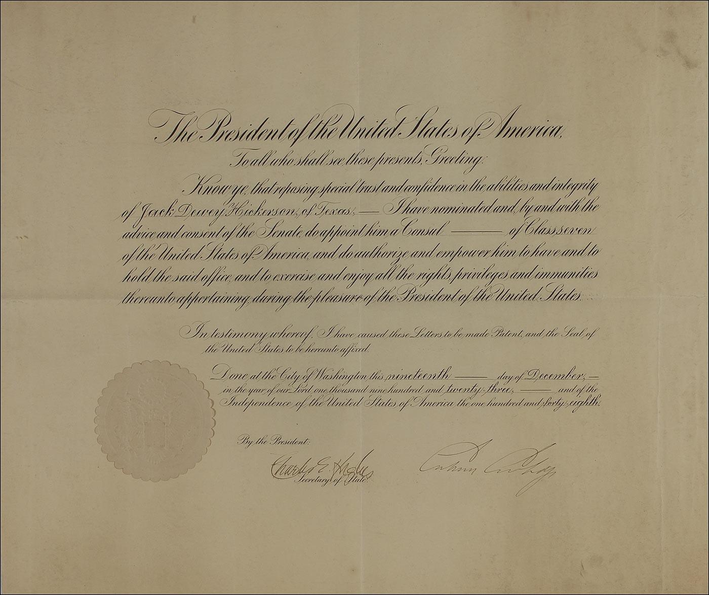 Partly-printed DS as president, one page, 21.5 x 18, December 19, 1923. Coolidge appoints Jack Dewey Hickerson “a Consul of Class seven of the United States of America.” Signed at the conclusion by Coolidge, and countersigned by Secretary of State Charles Evans Hughes. In very good condition, with central horizontal and vertical fold, some scattered light creasing, and some mild soiling, primarily to right side. Pre-certified John Reznikoff/PSA/DNA and RRAuction COA.