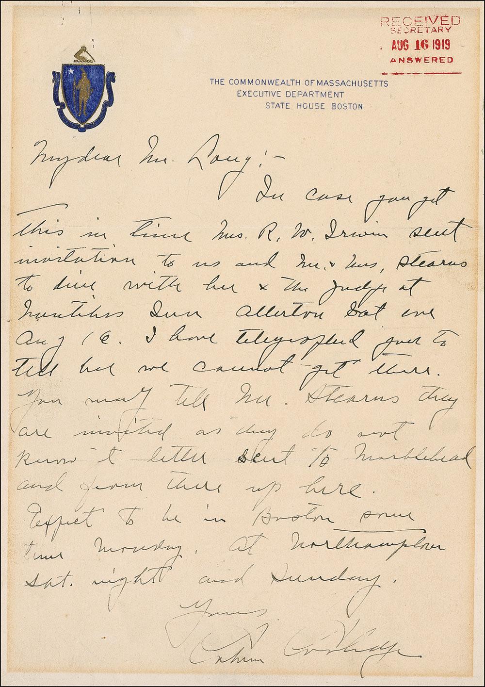 ALS, one page, 7.5 x 10.5, Commonwealth of Massachusetts letterhead, no date. Letter to Mr. Long regarding an upcoming dinner. In part: “In case you get this in time Mrs. R. W. Irwin sent invitation to us and Mr. & Mrs. Stearns to dine with her and the Judge…I have telegraphed just to tell her we cannot get there.” In very good condition, with uniform toning from previous display, rusty paperclip marks to top edge, and an office stamp dated August 16, 1919, to top right. Pre-certified John Reznikoff/PSA/DNA and RRAuction COA.