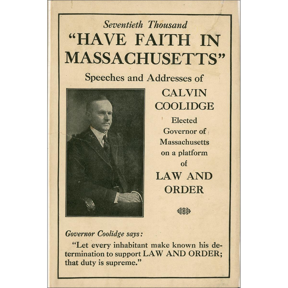 Signed book: Have Faith in Massachusetts. First edition. NY: Houghton Mifflin Company, 1919. Hardcover with dustjacket, 5.5 x 8, 224 pages. Signed and inscribed in fountain pen on the half-title page, “To Hon. Hiram Bingham, With Regards, Calvin Coolidge.” In very good condition with light toning, slight vertical bend to the signature page, pencil markings on some of the pages, and creasing and a tear across the covers and spine of the dustjacket repaired on the back with old tape, and light wear to boards and spine. Accompanied by a custom-made slipcase. Bingham was a a senator from Connecticut and explorer who rediscovered the Inca city of Machu Picchu.