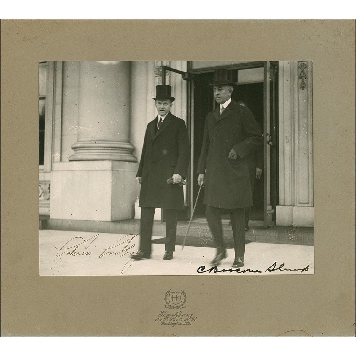 Vintage matte-finish 9 x 7 photo of Coolidge and his secretary C. Bascom Slemp exiting a building, signed in fountain pen by both men. Photo is affixed to its original 12 x 10.75 Harris and Ewing photographer’s mount. Scattered fingerprints and surface marks, not detracting from overall appearance, otherwise fine condition. Mount shows some light toning and minor damp staining along bottom edge.