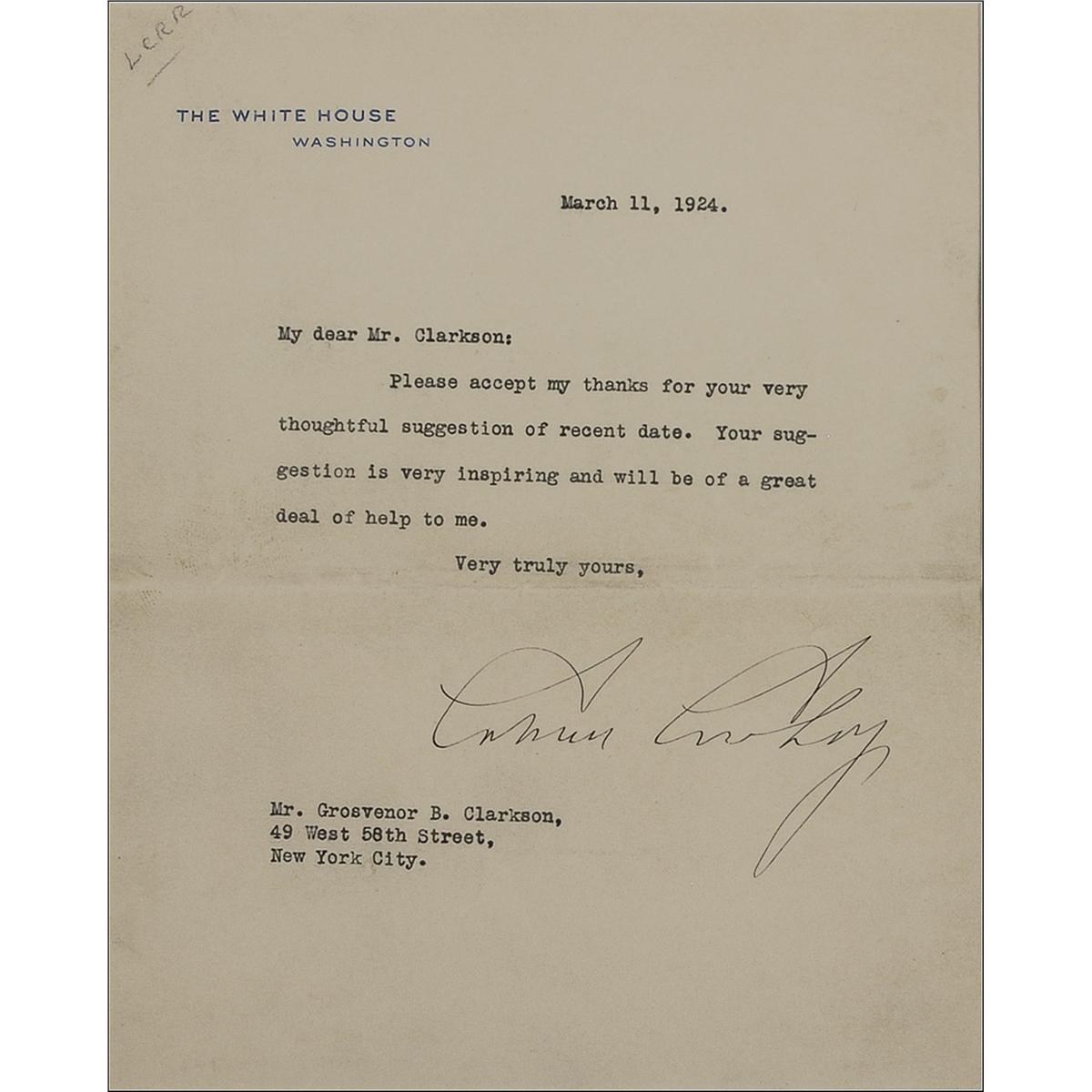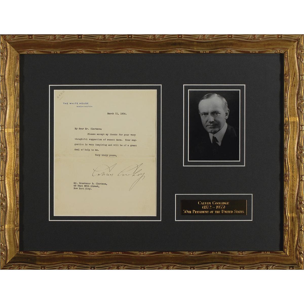 TLS as president, one page, 6.5 x 8, White House letterhead, March 11, 1924. Short letter of thanks. In full: “Please accept my thanks for your very thoughtful suggestion of recent date. Your suggestion is very inspiring and will be of a great deal of help to me.” Archivally double matted and framed with a portrait and name plaque to an overall size of 19.5 x 15.25. In fine condition, with some light toning and a pencil notation to top left.