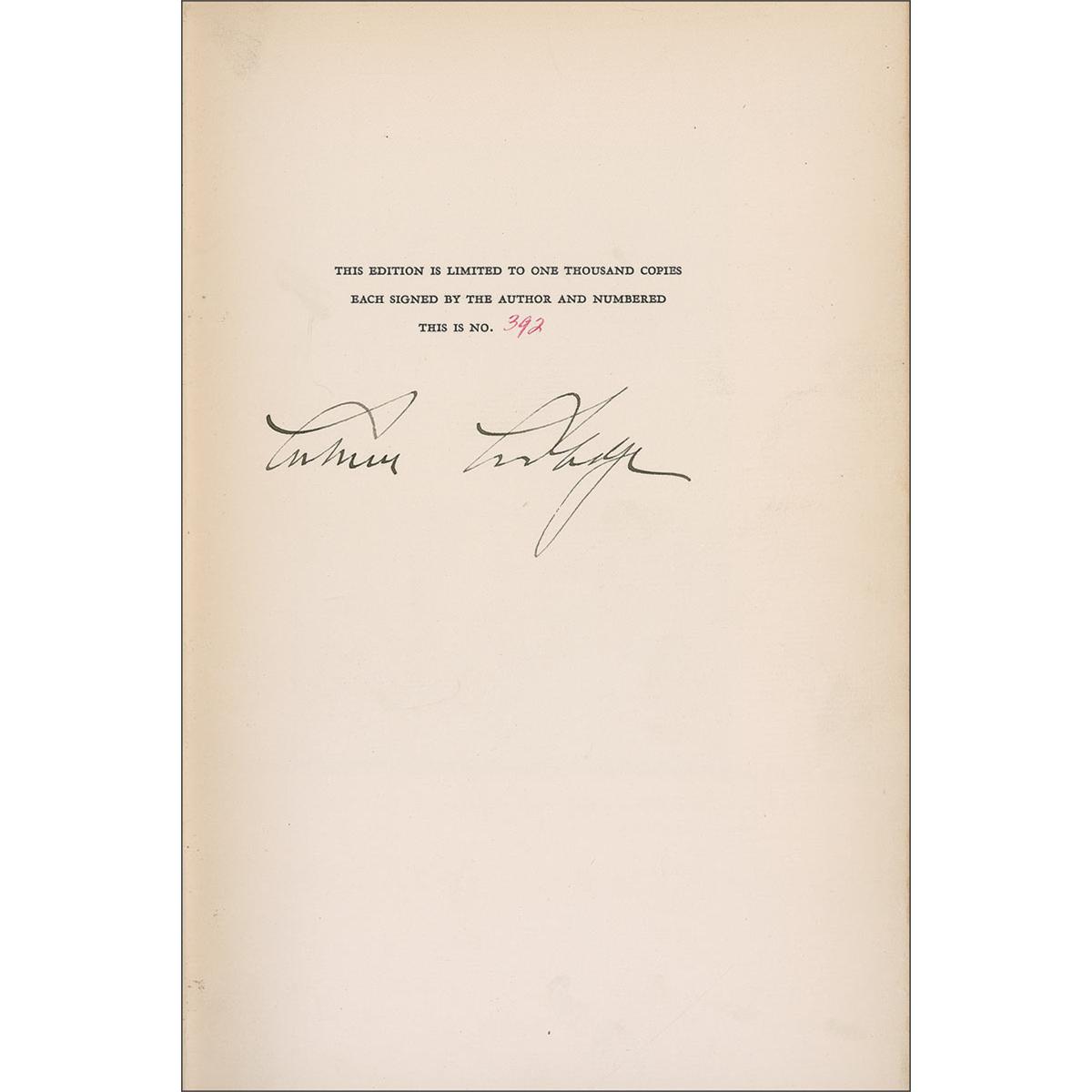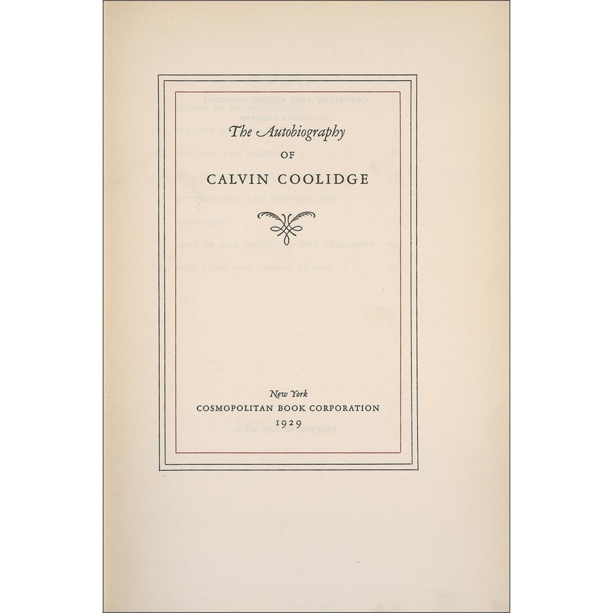 Signed book: The Autobiography of Calvin Coolidge. Limited edition of 1,000 copies (this copy No. 392). NY: Cosmopolitan Book Corporation, 1929. Hardcover, 6.25 x 9.5, 247 pages. Signed in fountain pen, “Calvin Coolidge,” on the limitations page. In fine condition, with very faint edge toning to the pages, a notation in pencil inside the front board, and light soiling and a few surface marks to the boards.