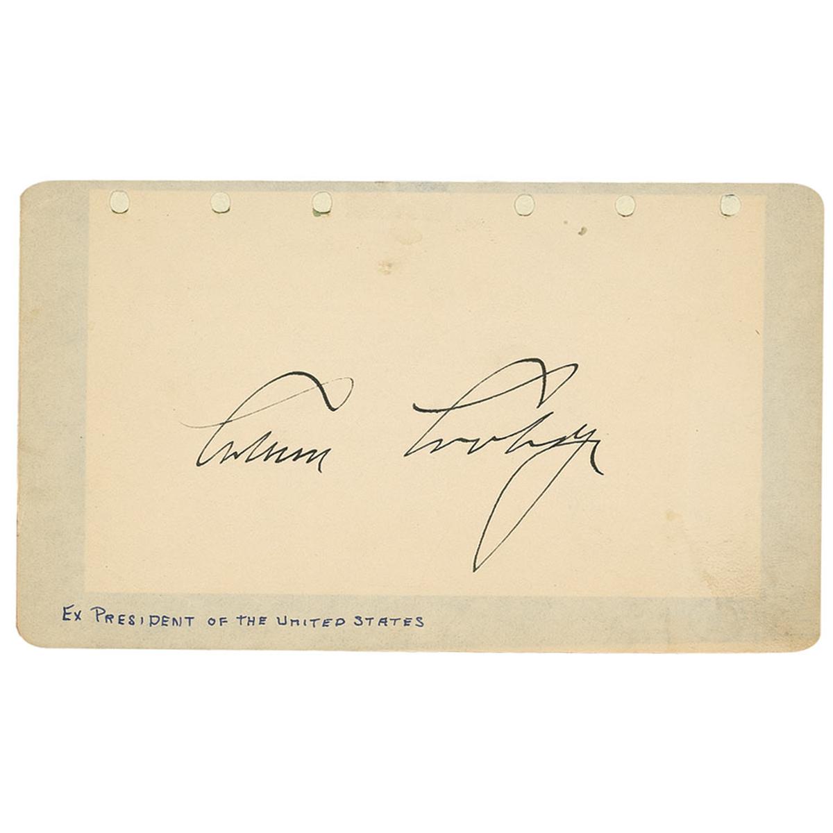 Ink signature, “Calvin Coolidge,” on an off-white 6 x 3.5 album page with a collector’s notation along bottom edge. In fine condition, with punch holes along top edge and a uniform shade of mild toning.