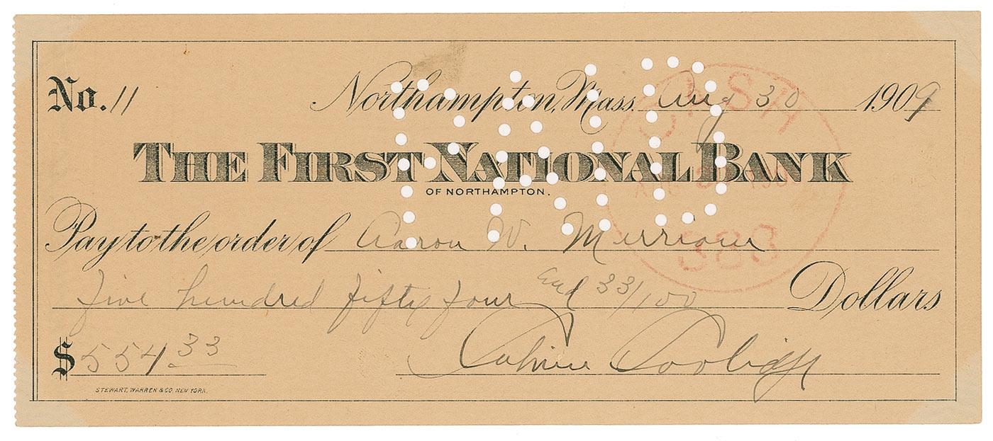 Bank check, 6.5 x 2.75, filled out and signed by Coolidge, payable to Aaron W. Murrow for $554.33, August 30, 1909. In fine condition, with cancellation holes and stamp to body, a bit of light soiling, and a uniform shade of mild toning.
