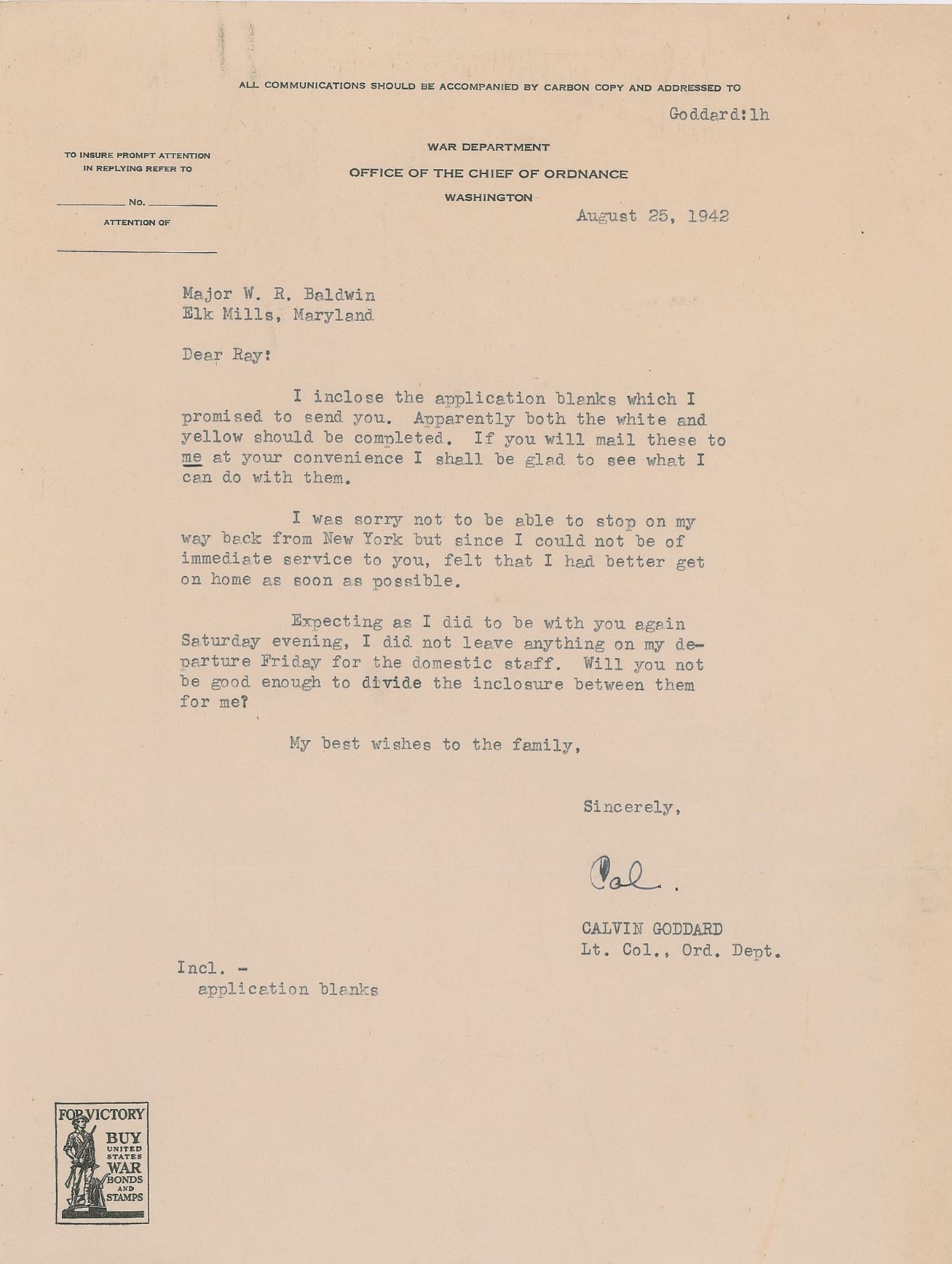 TLS signed “Cal,” one page, 8 x 10.5, War Department, Office of the Chief of Ordnance letterhead, August 25, 1942. Letter to Major W. R. Baldwin, in part: "I enclose the application blanks which I promised to send you. Apparently both the white and yellow should be completed. If you will mail these to me at your convenience I shall be glad to see what I can do with them." In very good to fine condition, with some light edge creasing, and a paperclip impression to the top edge.