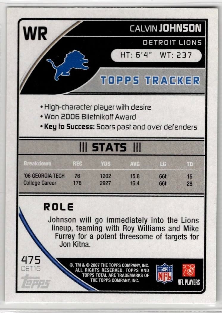 Calvin Johnson Rookie Card 2007 Topps Total #475