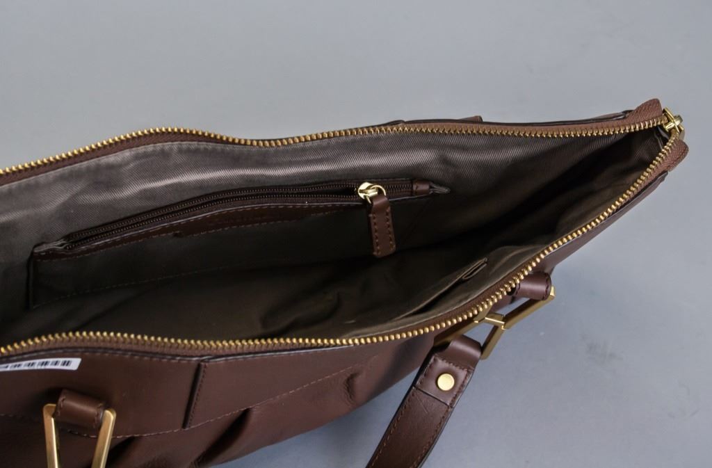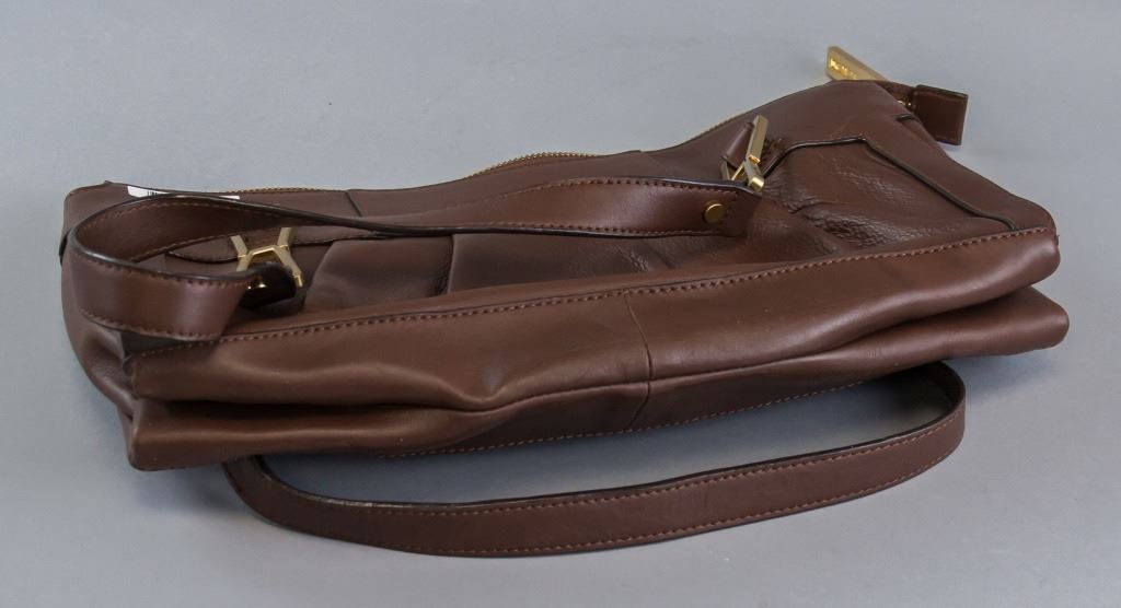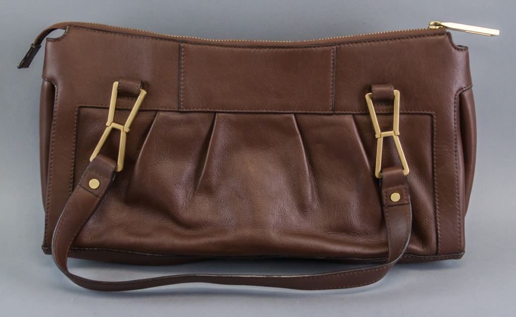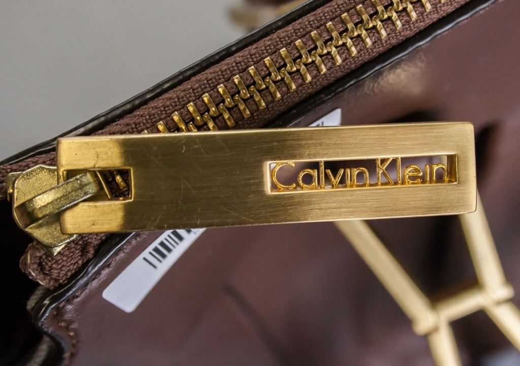 Brown purse. "Calvin Klein" stamped into zipper. With two handles. Not authenticated. 21 x 36 cm. 388 grams.