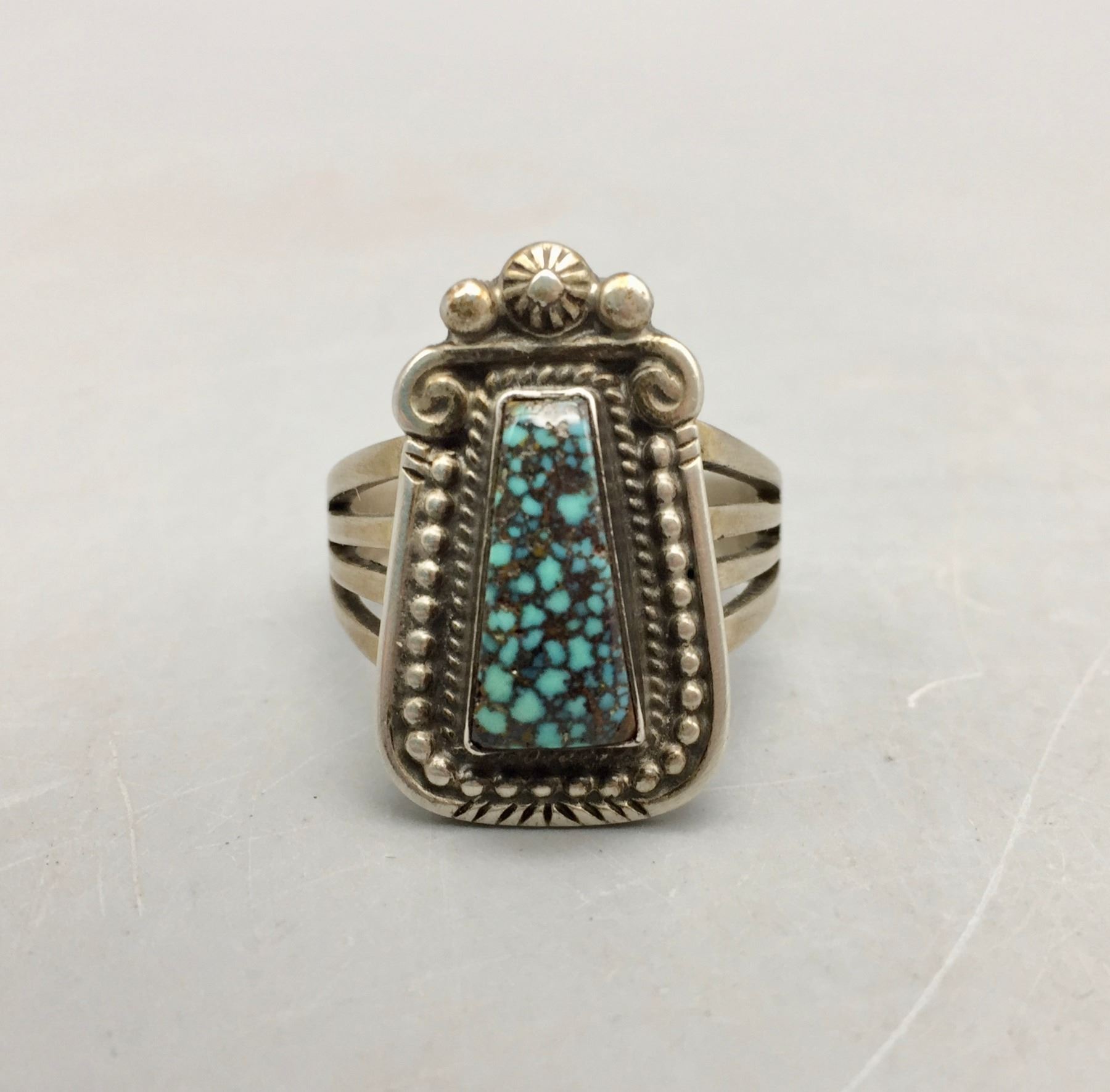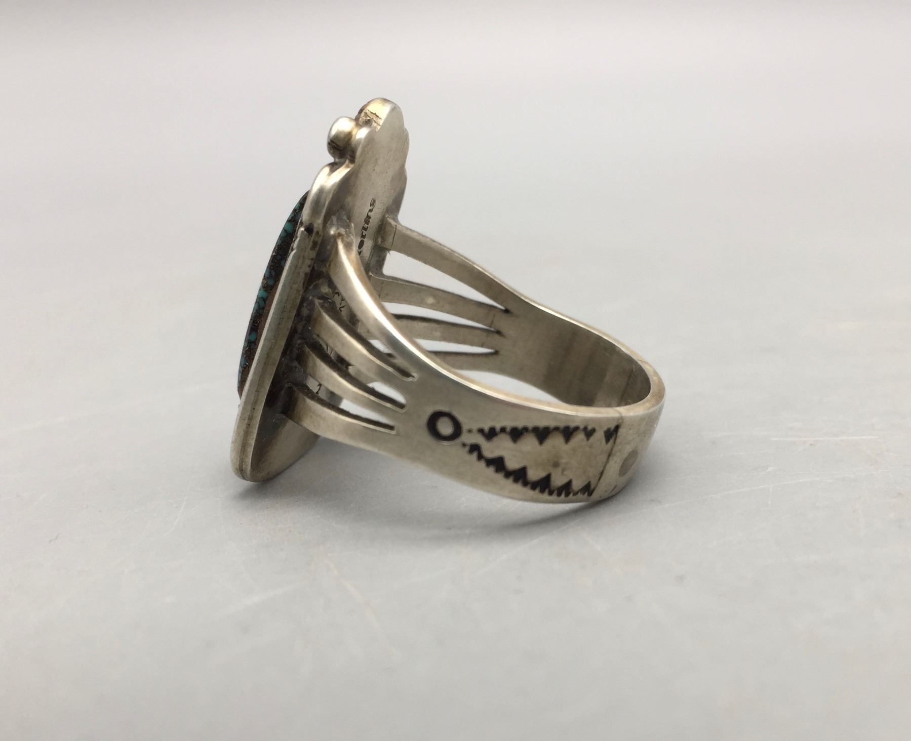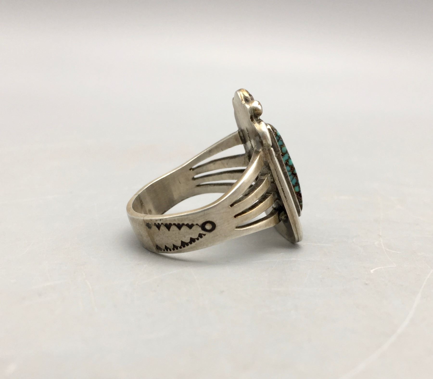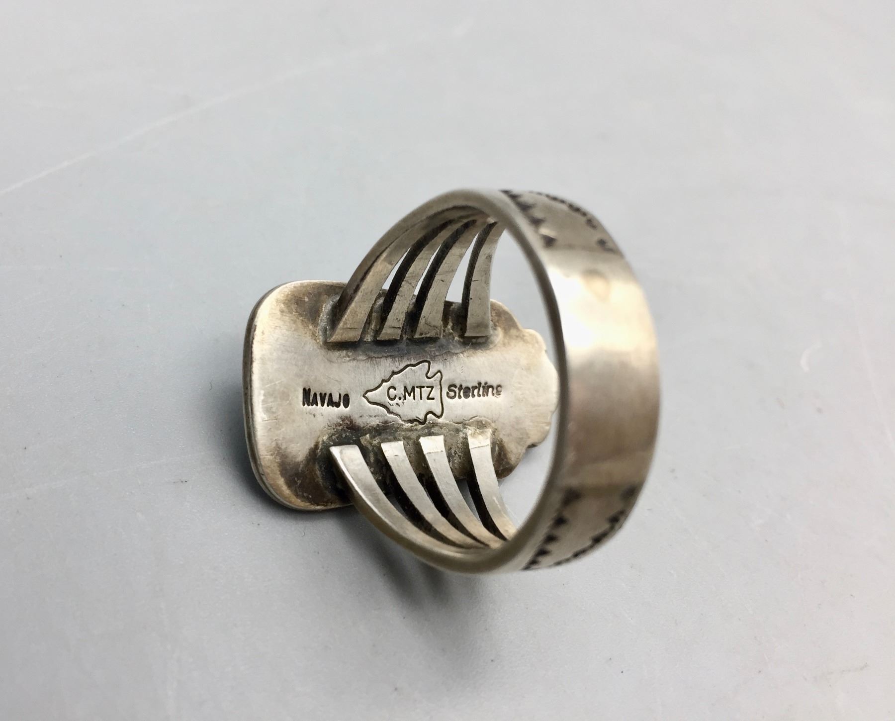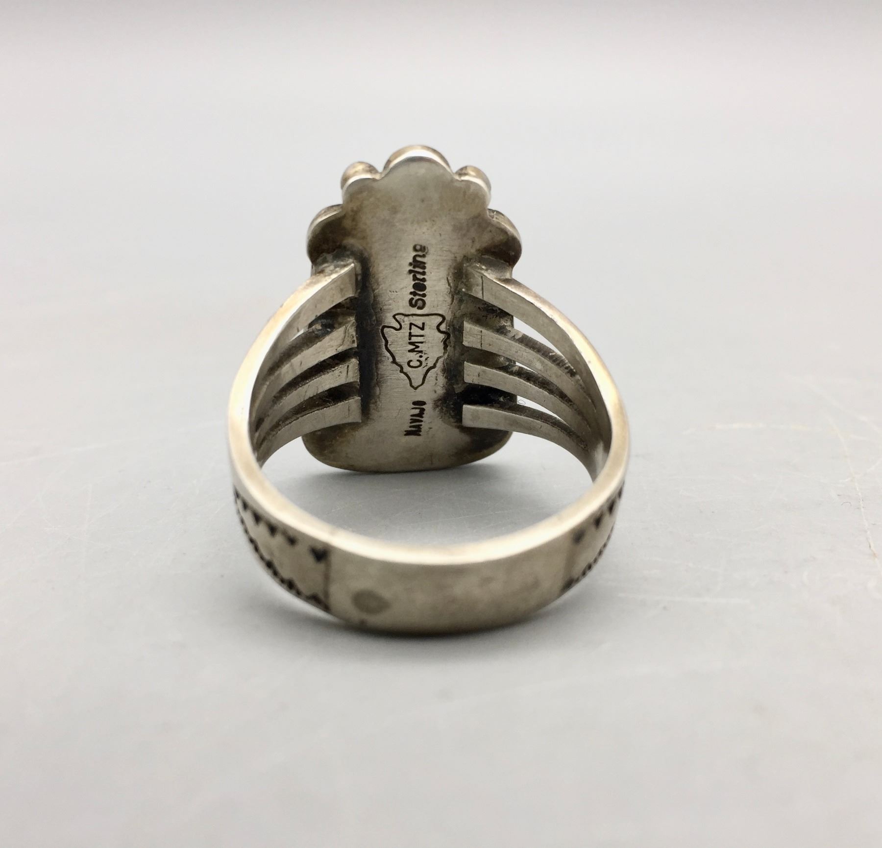 Description: For your collection, this lot has a beautiful ring by Calvin Martinez. Set with a stunning #8 mine turquoise stone. Stamped as sterling silver.                                                                                                           Maker: Hallmarked Arrowhead C.MTZ, Calvin Martinez, Navajo.                                                                                                                  Approx. Age: Modern.                                                                                                            Size: Size 13. 1-1/8” long x 5/8” wide. Weighs 14 grams.                               Condition: Good for its age, normal wear expected.                                                                                                                Please look closely at the pictures - they are an important part of our description.                                Shipping: There will be a $5 handling / packaging fee for shipping this lot. The actual cost of postage will be added on top of that.