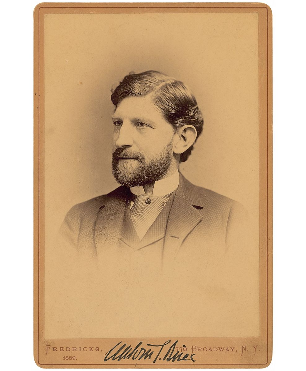 Politician and officer in the Union Army (1845–1898) who later amassed a fortune, mainly in railroads. Original 4 x 6.5 cabinet photo by Fredrick’s of New York, signed in the lower border in black ink, “Clinton S. Brice.” In fine condition.