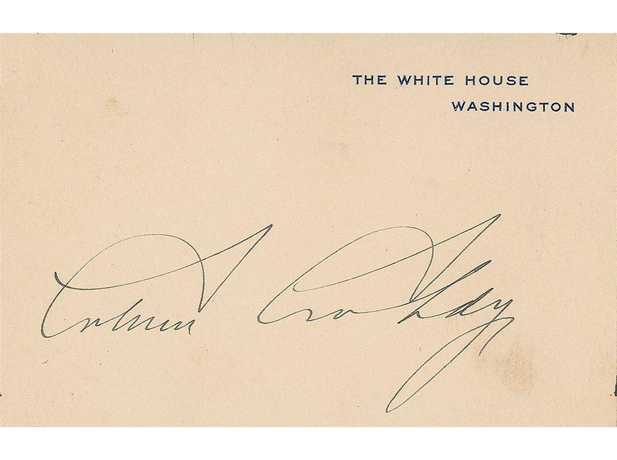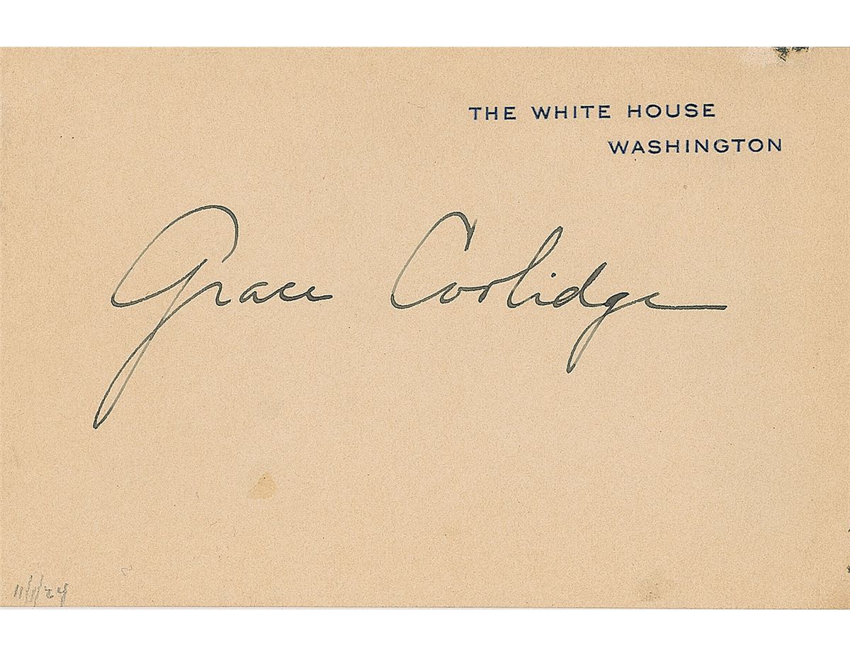 Fine pair of White House cards, signed individually in crisp black ink, “Calvin Coolidge” and “Grace Coolidge.” Some mild toning and soiling, a few dark marks to extreme edges, and light notations and adhesive remnants to reverse, otherwise overall fine condition.