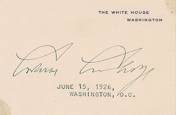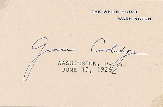 Desirable pairing of official White House cards, individually signed in fountain pen by the president and first lady, "Calvin Coolidge" and "Grace Coolidge," with typed notations dating the signatures to June 15, 1926. In fine condition, with mounting residue to two corners of each card.