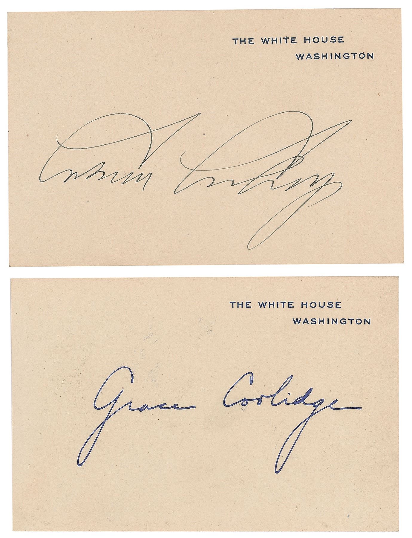 Two official White House cards, individually signed in ink by the president and first lady, "Calvin Coolidge" and "Grace Coolidge." In fine condition, with old scrapbook remnants on the back of the Grace Coolidge card.