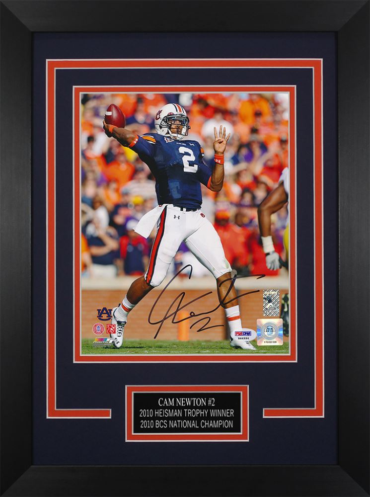A beautifully Framed Autographed Cam Newton Auburn Tigers Photo. The Autographed Photo is certified by PSA and includes a sticker on the Photo and a matching certificate attached to the back of the frame.