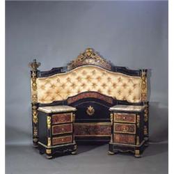 Cama estilo Boulle, ffs. S. XIX. Medidas:154 x 148 cms. Cabecero tapizado en seda capitoné. Faltas. A juego con el lote anterior y los siguientes.