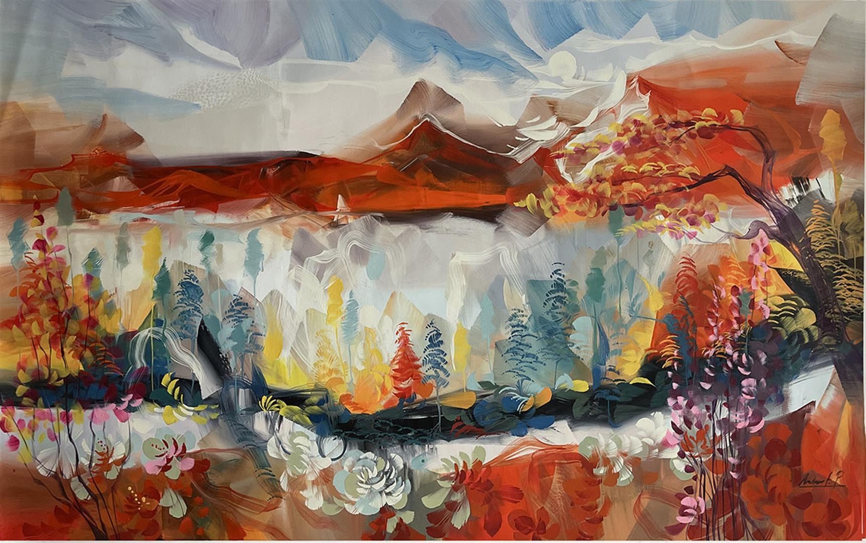 Bright and beautiful original acrylic on canvas. Hand signed by artist. This artwork comes rolled. Approximately 80x48 inches