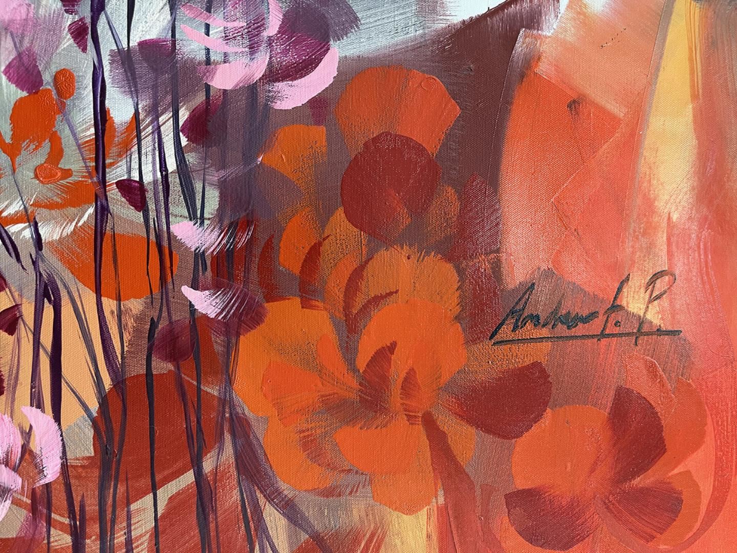 Bright and beautiful original acrylic on canvas. Hand signed by Palacios. This artwork comes rolled. Approximately 80x48 inches