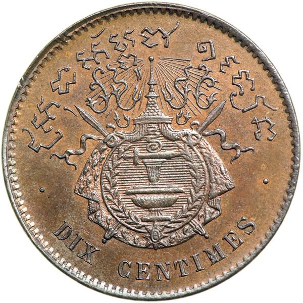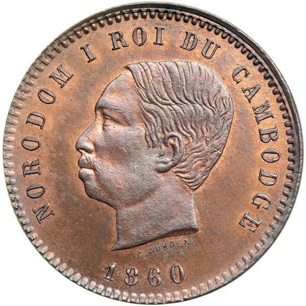 Cambodia. 10 Centimes, 1860. KM-X3. Bronze. Norodom I. Head left. Reverse: Pagoda topped and mantled arms. NGC graded MS-65 Red & Brown.