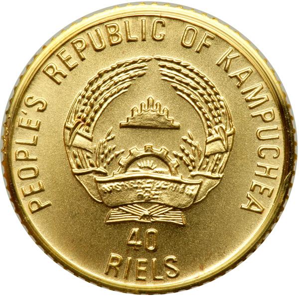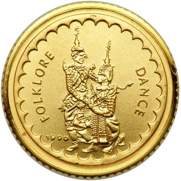 Cambodia. 40 Riels, 1990. Fr-11a; KM-82. Weight 0.0400 ounce. Mintage 500 pieces. National emblem. Reverse: Folklore dance. Brilliant Uncirculated.