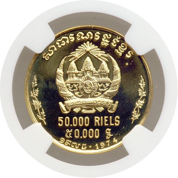 Cambodia. 50000 Riels, 1974. Fr-8; KM-64. Weight 0.1942 ounce. Cambodian dancers. NGC graded Proof 67 Ultra Cameo.