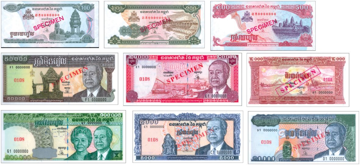 This Specimen Set was issued by the National Bank of Cambodia. It comprises 1,000 Riels (P44s), 2,000 Riels (P45s), 5,000 Riels (P46s), 10,000 Riels (P47s), 20,000 Riels (P48s), 50,000 Riels (P49s) all of which are overprinted SPECIMEN?in red, 100,000 Riels (P50s) with perforated SPECIMEN. These notes all have serial 000000 with a special note number 0108 (much the same as Australian Polymer Specimens). All of these are housed in the Bank album of issue along with the 50, 100, 200 and 500 Riels coins. Accompanying this are three other SPECIMENS: 100 Riels (P41s), 200 Riels (P42s) and 500 Riels (P43s) - all of which feature red overprints.