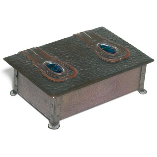 Nice Cambray Ware box, english, hammered copper with its original patina, applied and inset copper and enamel designs, impressed mark,7.5in.l