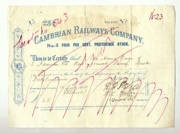 1885, England. No. 3 four per cent. preference stock. Ornate left border. Pen cancelled.