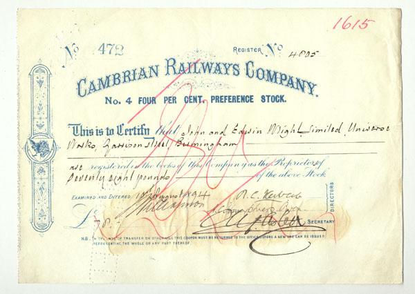 1894, England. No. 4 Four Per Cent Preference stock. Ornate left border. Pen cancelled.