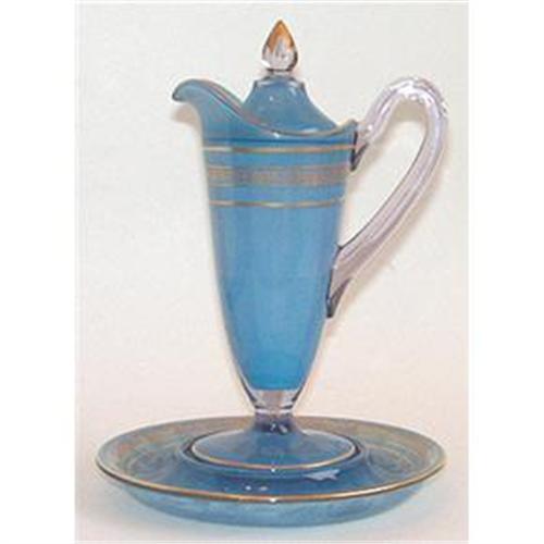 This rare cased pastel blue Elegant Depression glass covered syrup pitcher with underplate was produced by the Cambridge Glass Co, circa 1930s, is shown on page 261 in Florence: Kitchen Glassware of the Depression Years; Sixth Edition. Teatures copious gold trim on all three pieces and a clear applied handlMeasures 7 inches or 8 1/4 inches tall including its lid x 3 inches across the base. Very rare to find complete with underplate and lid this Elegant Depression glass syrup pitcher is in excellent condition.