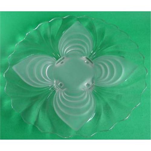 Produced by the Cambridge Glass Co. from 1936-1957 in their Caprice Alpine pattern this lovely oval four footed centerpiece service, torte or cake plate measures 14" across x 2" tall. This outstanding plate has alternating frosted panels, this frosted treatment was refered to by the Cambridge glass company as Alpine Caprice and it is in excellent condition.
