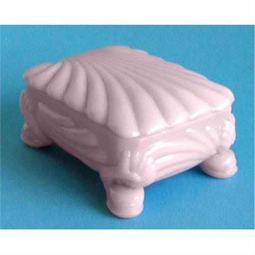 Cambridge produced their Crown Tuscan or milky pink glass from the late 1930s through to the 1950s. This beautiful and finely detailed Crown Tuscan jewelry or cigarette box features a shell motif and feet sculpted into serpants. Measures about 2 3/4 inches tall x 5 inches long x 4 inches wide and quite heavy - both the jar and lid are in excellent condition.