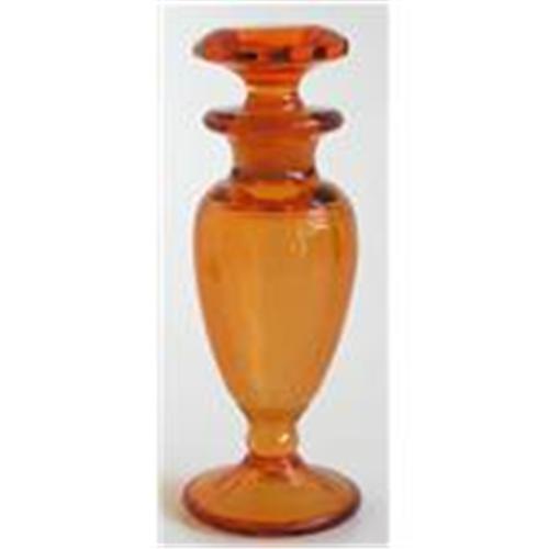 This lovely amber colored Elegant Depression glass perfume bottle, measures 4 3/4" tall. Featuring a lovely Art Deco shape and a twelve sided jewel like stopper. Produced by the Cambridge Glass Co. during the 1930s, known as #198, shown and described on pages 74-75in Whitmyer. The stopper, although missing its dauber, as well as the bottle are both in excellent condition.
