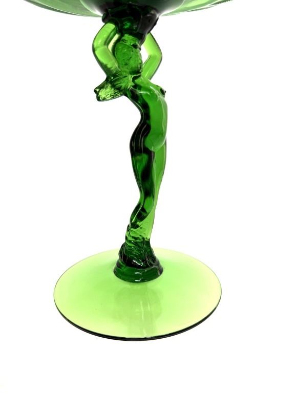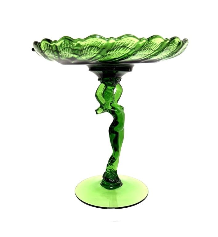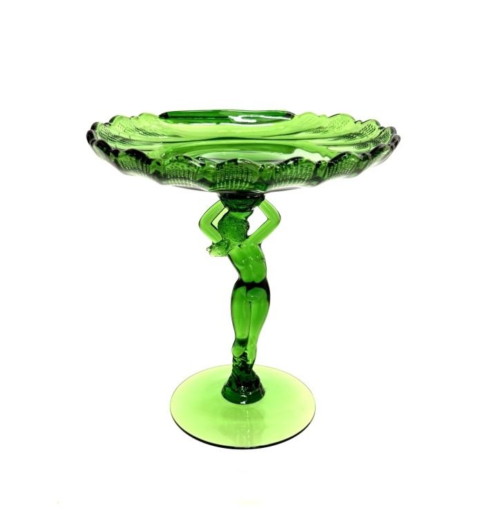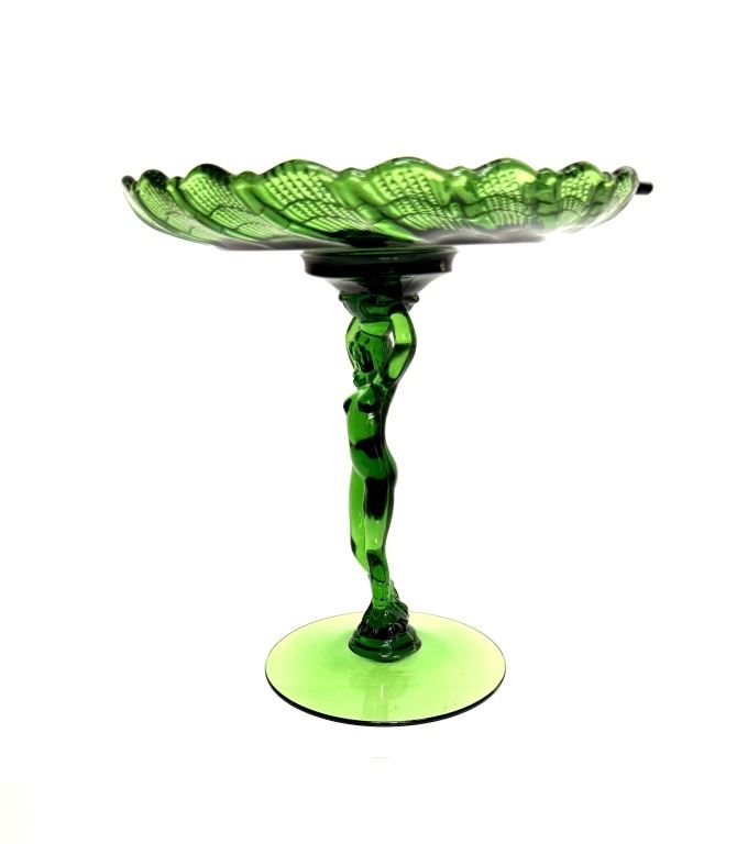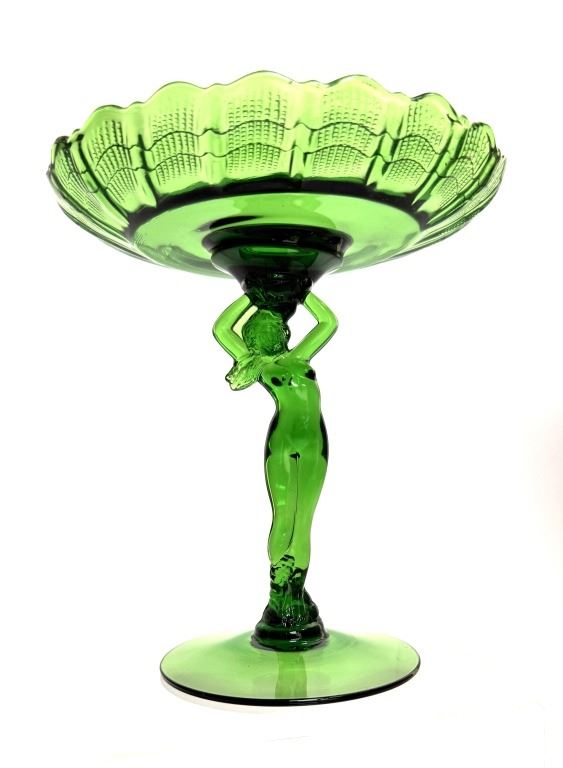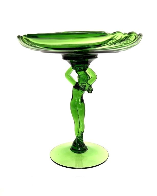 Item/Description: This Cambridge Glass Nude Stem compote dish features a striking flared, seashell bowl supported by a clear, sculpted nude female figure as the stem in a rich emerald green color. This "Statuesque" or "Nude Stem" Art Deco-style piece was produced from 1931 until 1958. Often used as a candy dish, or serving bowl, the comport serves as a beautiful accessory and functional piece of Art Deco history.