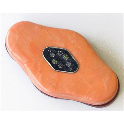 </font></strong>This Art Deco vanity or dresser make-up compact was produced during the 1930s. The mottled salmon pink celluloid or Bakelite top is adorned with a hand painted emblem. The burnt orange heavy Depression glass base was produced by the Cambridge Glass Co. It has four compartments for powder & puff, eyebrow pencil, lipstick and rouge. Measuring 8 3/4 inches long x 4 3/4 inches wide x 3 1/4 inches tall to top - the original puff is included - this wonderful and very hard to find Art Deco dresser make-up compact is entirely in excellent condition.</font>