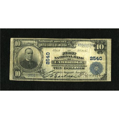 <B>Cambridge, IL</B></I> - $10 1902 Plain Back Fr. 633 <B>The First NB</B></I> Ch. # 2540<BR>Bold penned signatures are noted on this Plain Back. Only one note from this institution was offered at public auction in 2006. <B>Very Good-Fine.</B></I><BR><I>From The Lincoln Collection</B></I><BR><BR><b>Shipping:</b> Coins & Currency (<a target="_blank" href="http://www.heritageauctions.com/common/shipping.php">view shipping information</a>)