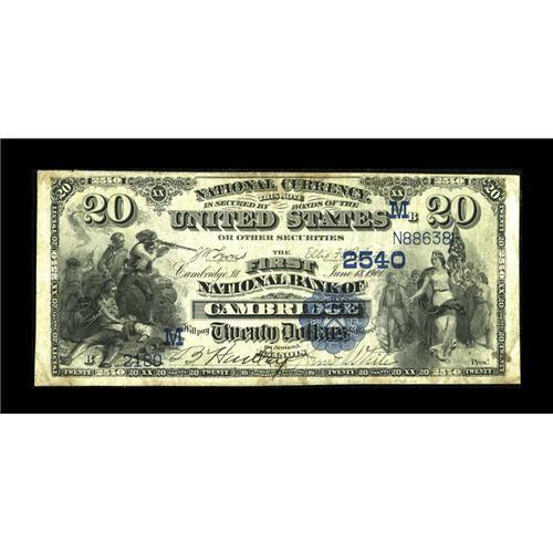<B>Cambridge, IL</B></I> - $20 1882 Date Back Fr. 555 <B>The First NB</B></I> Ch. # (M)2540<BR>The pen signatures remain sharp on this <B>Fine-Very Fine</B></I> example that has a few spots mainly in the corners. Eleven large size are recorded in the Kelly census, with this the sole $20 Date Back.<BR><I>From The Lincoln Collection</B></I><BR><BR><b>Shipping:</b> Coins & Currency (<a target="_blank" href="http://www.heritageauctions.com/common/shipping.php">view shipping information</a>)