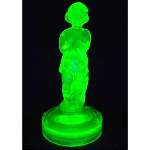 Very charming "Cambridge Lady" vaseline glass lamp base, measuring approximately 8.25 inches high and 4 inches in diameter at the base. This glass piece, which glows under a black light, is designed as a lamp base but does very well as a stand alone piece. It is in very good condition, with no chips or cracks; the base has a few "straw" marks. Please refer to the 4 photographs for appearance and condition. Shipping / packaging / handling will be $11.00.