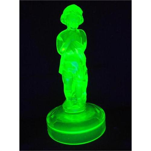 Very charming "Cambridge Lady" vaseline glass lamp base, measuring approximately 8.25 inches high and 4 inches in diameter at the base. This uraniumglass piece, which glows intensely under a black light, is designed as a lamp base but does very well as a stand alone piece. It is in very good condition, with no chips or cracks; the base has a few "straw" marks. Please refer to the 4 photographs for appearance and condition. Shipping / packaging / handling will be $11.00.