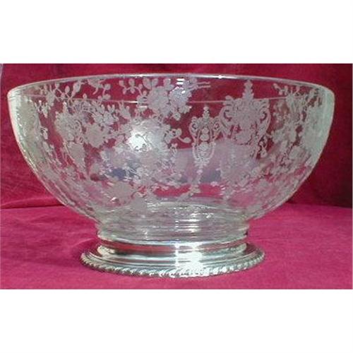 Beautiful Rose Point Salad Bowl with a sterling silver base. Elegant etched glass by Cambridge, silver marked Wallace/ Sterling/ 4641