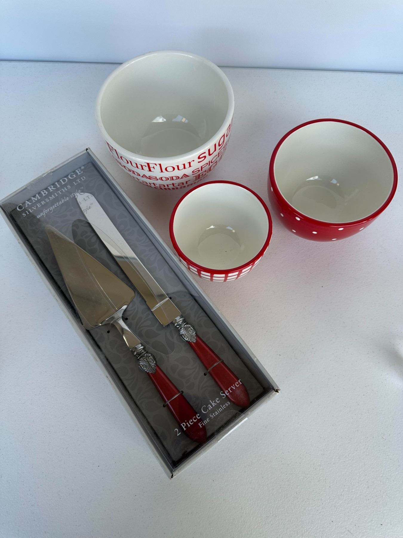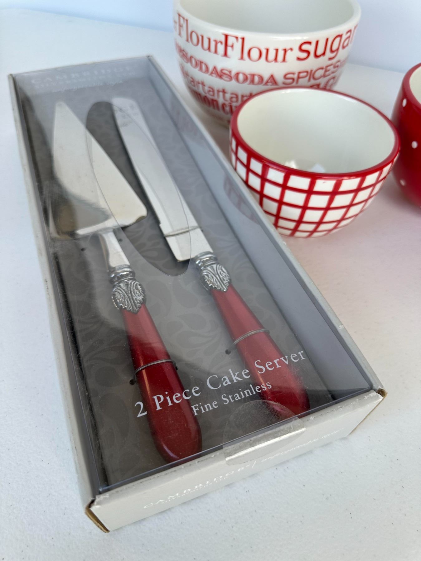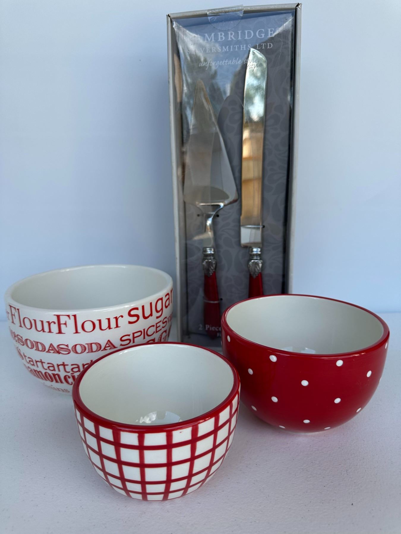 Boxed Cambridge Silversmiths cake knife and server set, paired with three ceramic bowls in coordinated red/white designs (check, polka dot, text).