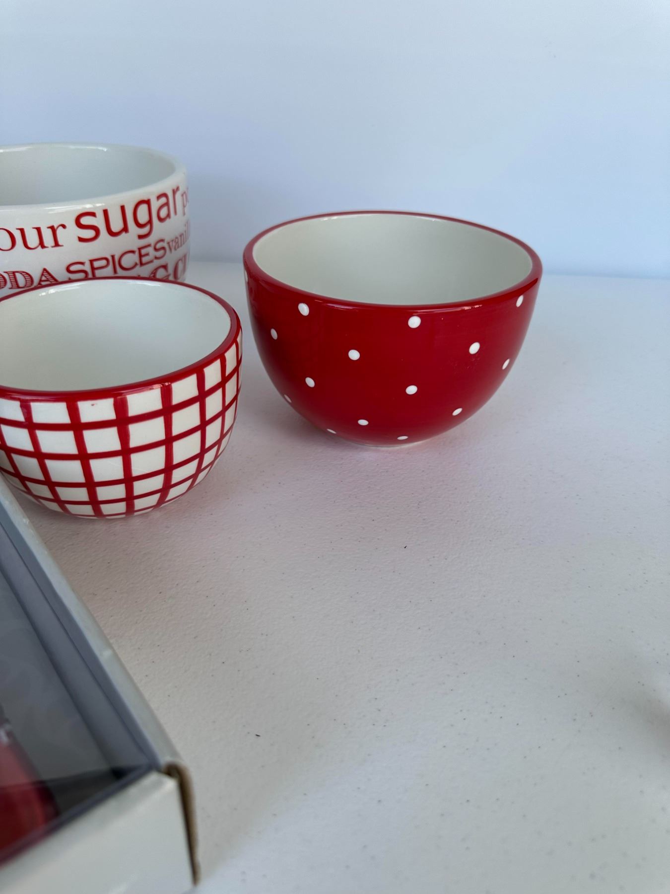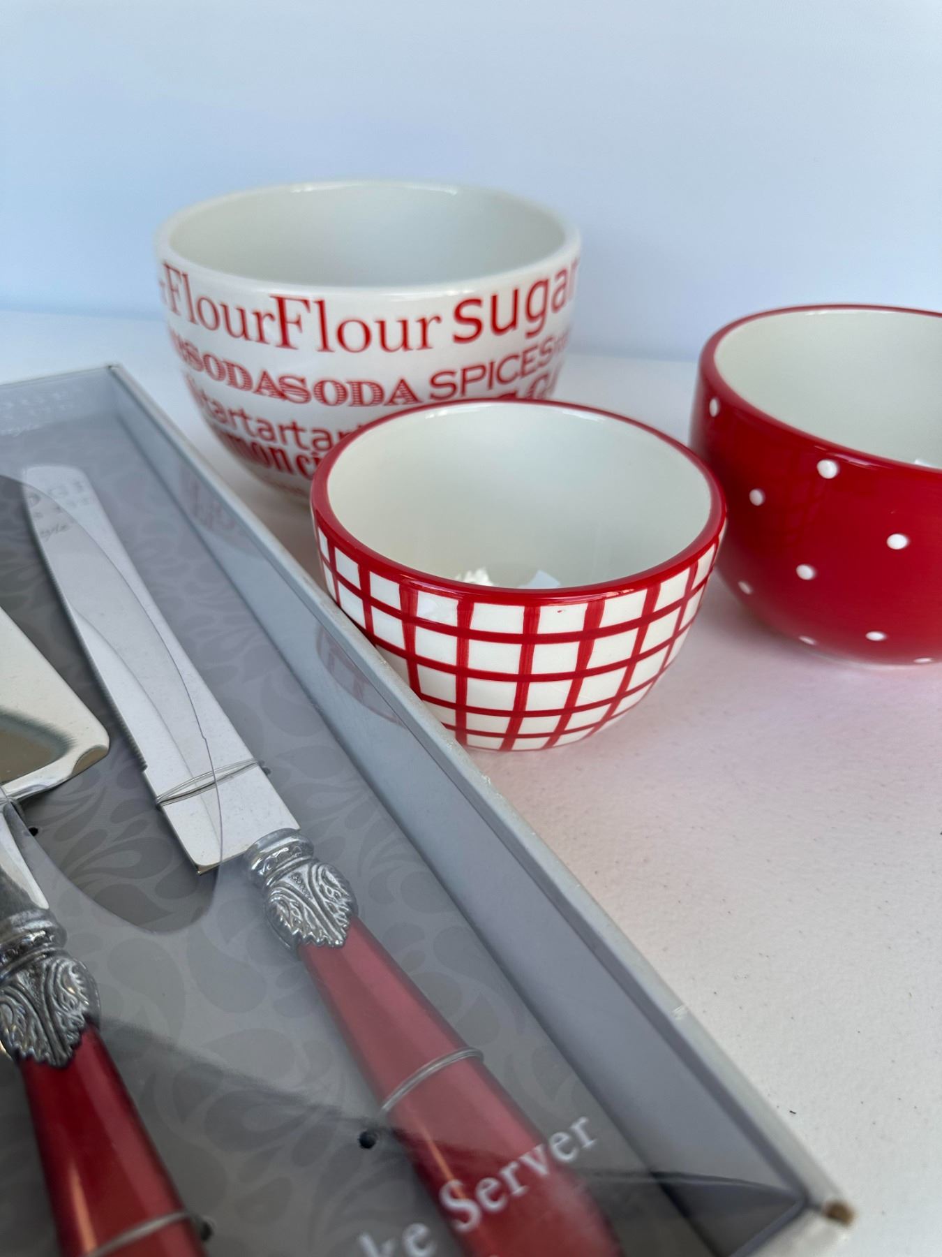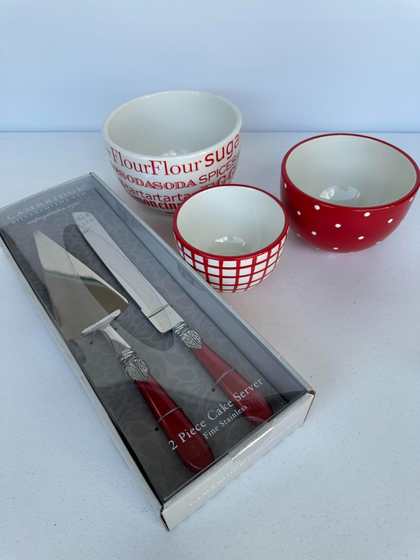 Boxed Cambridge Silversmiths cake knife and server set, paired with three ceramic bowls in coordinated red/white designs (check, polka dot, text).