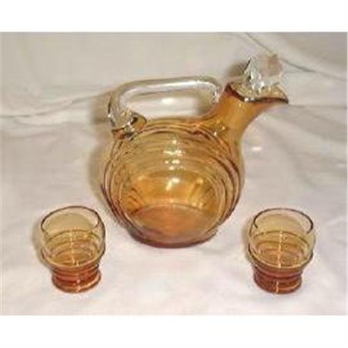 Cambridge 14oz. Decanter with 2 cordials in Amber colored Glass. Pattern # 3450. Stopper is not original, but nice cut glass piece. Circa 1930. 5" x 5". Cordials 2" x 1 3/4". Excellent Condition.