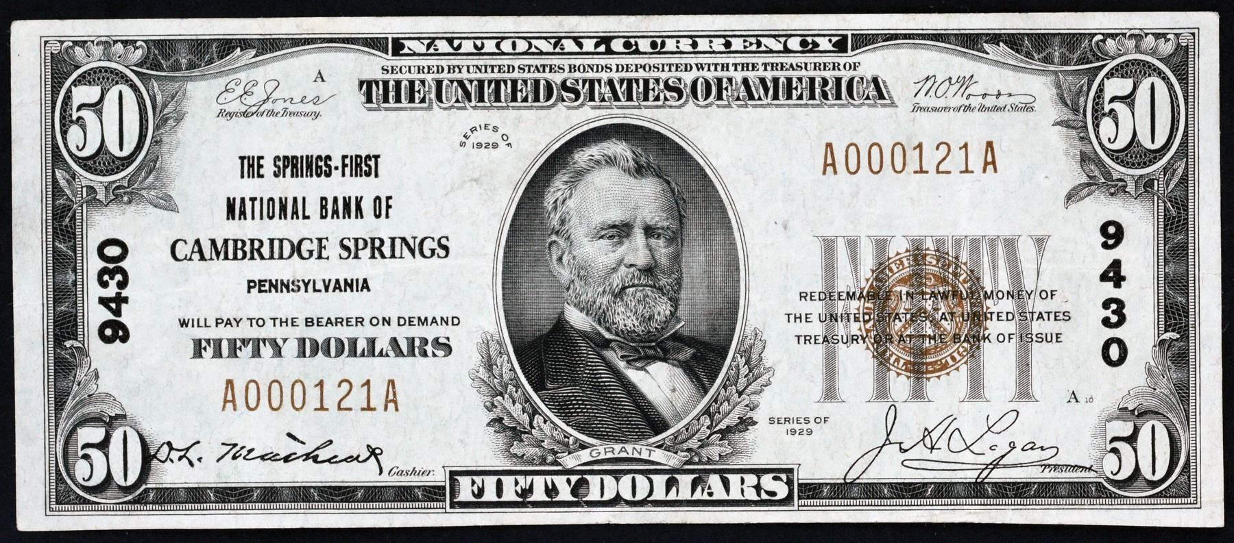 Cambridge Springs, Pennsylvania  -  $50  1929 Type 1  Fr. 1803-1  The Springs-First National Bank of