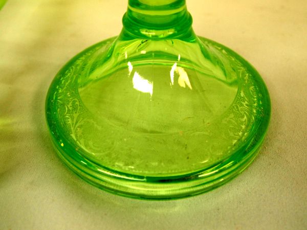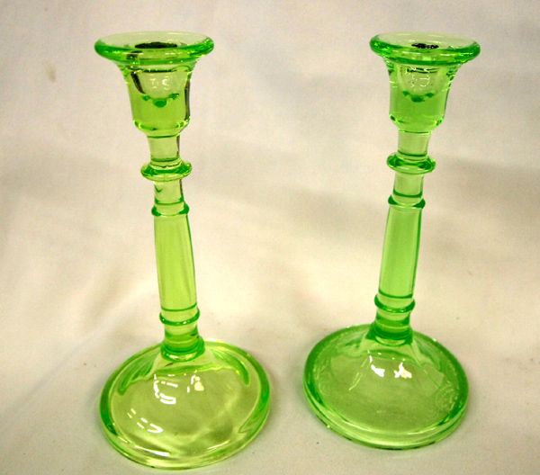 Cambridge Vaseline Glass Candlesticks. Two candlesticks, not a pair, one has an etched pattern around the base, the other plain; however, same blank. Measures 9.5''. Beautiful pieces of Cambridge Vaseline glass!