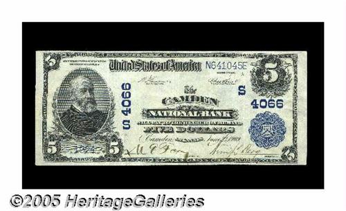 <B>Camden, AR</B></I> - $5 1902 Plain Back Fr. 600 <B>The Camden NB</B></I> Ch. # (S)4066<BR>This is a very scarce bank in large size, and a prohibitively rare one with this title, the first used here. The new Kelly census shows the entire population bearing this title consisting of just two Brown Backs, one a five and one a fifty, both of which have long since been off the market. This newly discovered piece is a beauty, with great paper quality, bold colors, and sharp pen signatures. Grading <B>Extremely Fine,</B></I> it's the finest large note of any kind known from here, and rare enough to see bidding easily reach and quite likely exceed...