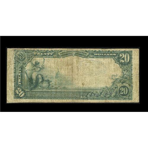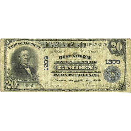 <B>Camden, NJ</B></I> - $20 1902 Plain Back Fr. 650 <B>The First National State Bank</B></I> Ch. # 1209<BR>A <B>Very Good </B></I> example of a bank which issued Third Charter notes under no less than three different titles. This is the second. Although the total population of large size from here stands in excess of 70 pieces, this addition to the census is just the third $20 Plain Back with this title to surface, again showing that even within the overall issues of relatively common big city banks there can be hidden treasures of considerable scarcity.
