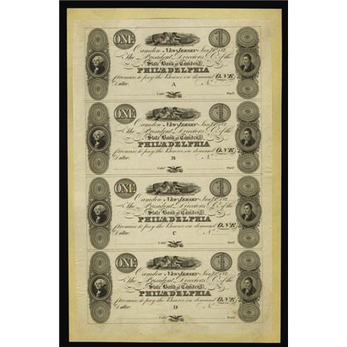 <B>Camden, NJ- State Bank</B></I> $1-$1-$1-$1 Jan. 1, 182_ G6-G6-G6-G6 Wait 321-321-321-321 Uncut Proof Sheet<BR>This uncut proof sheet has been mounted on light card stock that is slightly larger than the sheet. Uncut proof sheets are rarely encountered, making this an extraordinary opportunity. A small tear is at bottom center, but it only affects the card stock. The city "Philadelphia" is prominent on the notes of this sheet because the president and directors wanted it to be known that their bank was "near Philadelphia." The State Bank became the National State Bank of Camden, charter number 1209, in 1865. <B>Choice Crisp Uncirculated.</B></I>