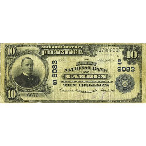 <B>Camden, SC</B></I> - $10 1902 Plain Back Fr. 626 <B>The First NB</B></I> Ch. # (S)9083<BR>A very tough note from the only bank in this historic community to issue. The large census from here now stands at 13, including this <B>Fine</B></I> $10 Plain Back.