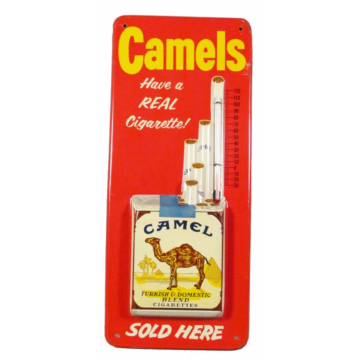 Camel Cigarette Embossed Tin Thermometer. Edge ware otherwise excellent, non-working condition. 5 3/4 X 13 1/2 inches.